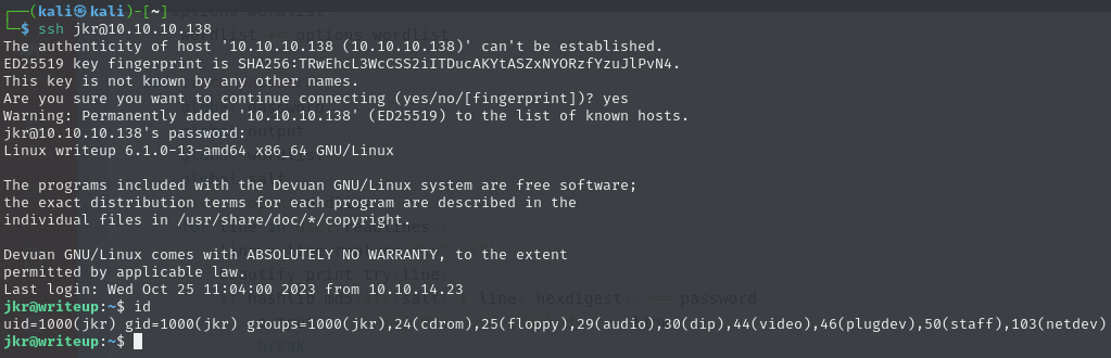 Then I SSH into the machine in order to cause root to execute the command which contains the