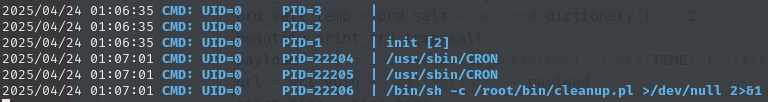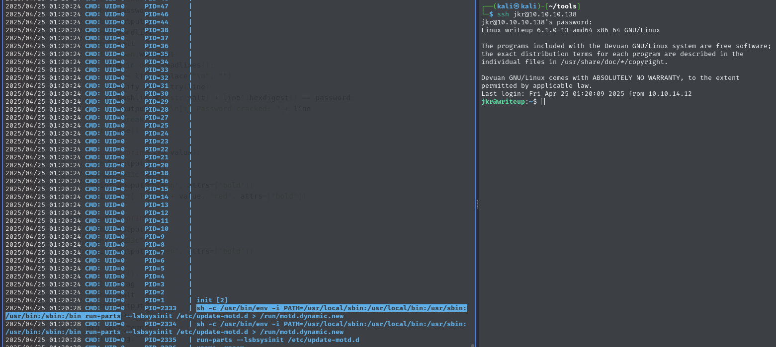 run-partsbinary is executed by root (UID=0) without the full path for that binary being specified. Following that, the environmentalPATHvariable, which will be used when finding therun-partsbinary, is specified, and it starts with/usr/local/sbin, which we can write to (on the left is output frompspy64- which logs running processes):