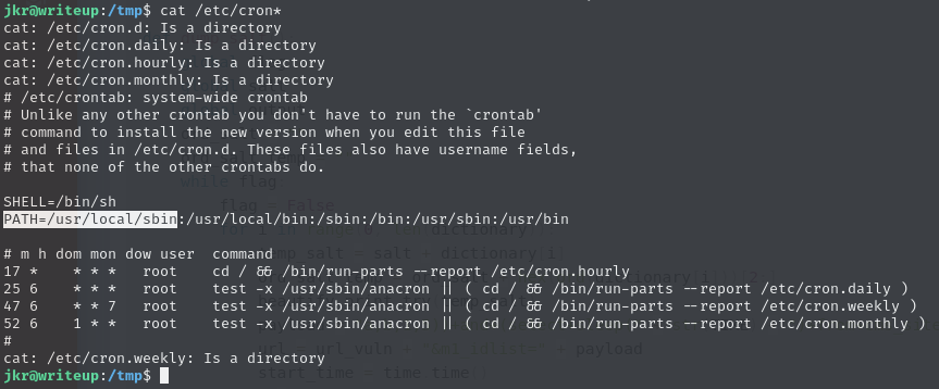 run-partsbinary. Because thePATHis set to look inside/usr/local/sbinfirst, root will execute my maliciousrun-partsbinary which enables the SUID bit on/bin/bash.