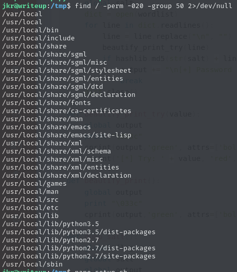 jkris in thestaffgroup (id=50) which gives us writeable permissions (-perm 020) to some unusual files:
