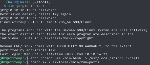 /usr/local/sbin), and becauserun-partspath is not defined, we can write a maliciousrun-partsbinary to/usr/local/sbinwhich will be executed by root when we SSH into the machine again.