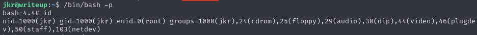 /bin/bashwith the-pflag, which allows me to inherit the privileges of the owner of the file (root). You can see that, whilst myuidis still1000(jkr), myeuid(effective uid) is0(root):